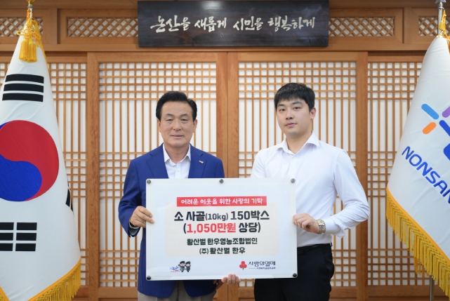 백성현 논산시장은 "한우 소비 감소로 사육 농가의 어려움이 큰 상황에서 매년 지역사회에 깊은 관심과 사랑을 베풀어 주시는 황산벌 한우영농조합법인과 (주)황산벌 한우에 진심으로 감사드린다”며 "이번 기탁으로 어려운 이웃이 풍요로운 명절을 보낼 수 있길 바란다”는 감사 인사를 전했다.