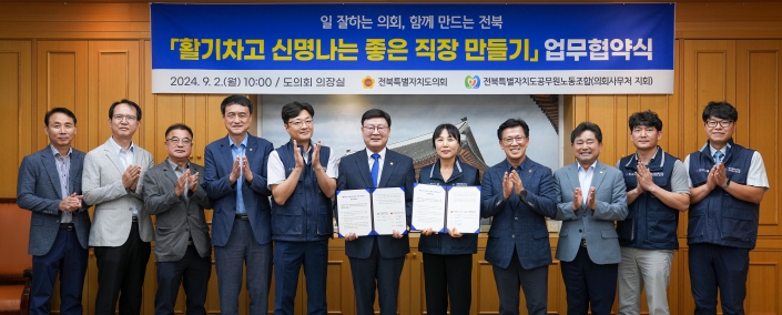 [뉴스서울] 전북특별자치도의회와 전북특별자치도공무원노동조합(의회사무처 지회)은 2일 도의회 의장실에서 ‘활기차고 신명 나는 좋은 직장 만들기’를 위한 업무협약을 체결했다.