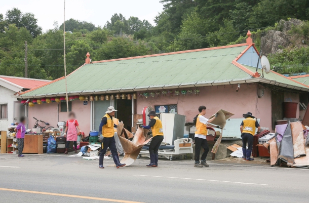 12일에 김기웅 군수를 비롯해 공직자, 청년네트워크 등 50여명은 종천면 피해가구를 찾아 침수된 주택 내부를 청소하고 토사 등 폐기물을 정리했다.