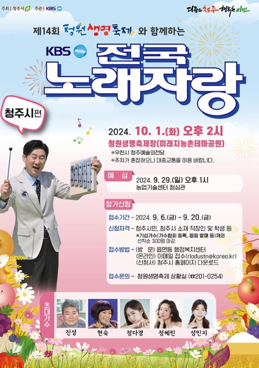 KBS 전국노래자랑 - 청주시편 참가를 원하는 시민들은 6일부터 20일까지 청주시 43개 읍면동 행정복지센터를 방문하거나 이메일로 신청하면 된다.