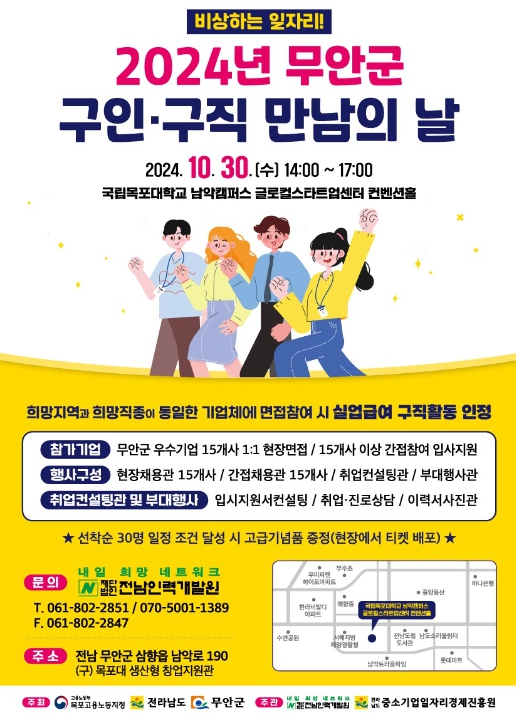 [뉴스서울] 전남 무안군은 오는 10월 30일 목포대학교 남악캠퍼스 글로컬스타트업센터 내 컨벤션 홀에서 개최 예정인 ‘2024년 무안군 구인·구직 만남의 날’ 행사에 참여할 기업을 모집한다.