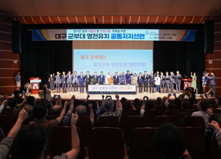 [뉴스서울] 영천시는 지난 26일 오후 2시 영천시민회관에서 최기문 영천시장, 김선태 영천시의장, 도·시의원, 영천 종교계(불교, 기독교, 천주교), 대구 군부대 유치 민간추진위원회 등 총 600여 명이 참석한 가운데 저출생 및 지방소멸 극복을 위한 대구 군부대 영천 유치 공동지지선언식을 개최했다고 밝혔다.