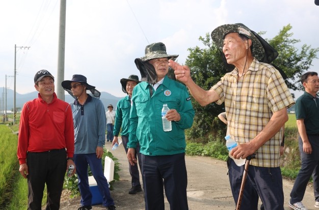 ▲ 이상근 경남 고성군수, 벼 병해충(혹명나방) 발생 현장 방문 |