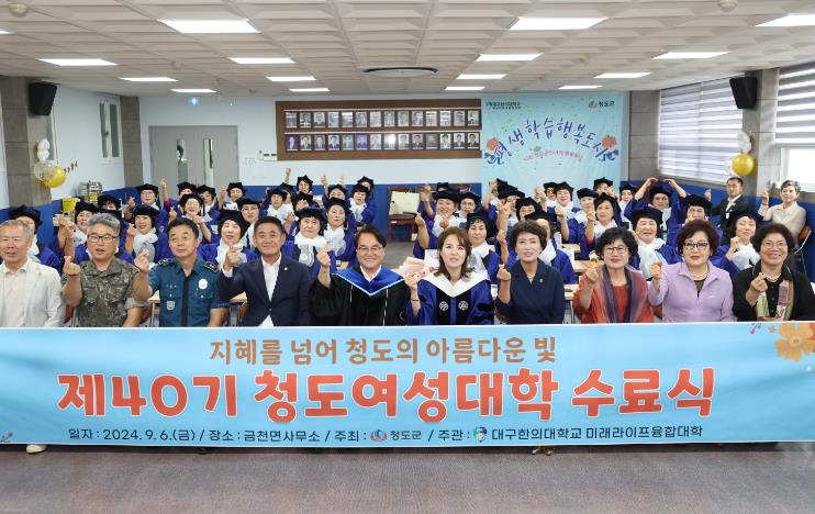 [뉴스서울] 청도군은 6일 금천면사무소에서 여성대학 수료생과 주요 내빈 등 60여 명이 참석한 가운데 제40기 청도여성대학 수료식을 가졌다.