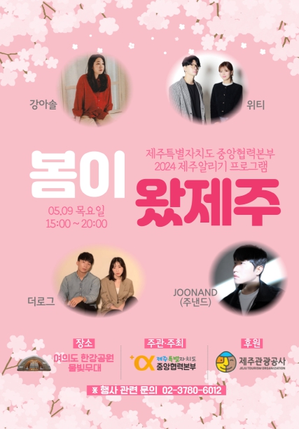 제주특별자치도 중앙협력본부는 9일 오후 3시 서울 영등포구 여의도한강공원 물빛무대 일원에서 아시아․태평양경제협력체(APEC) 정상회의 제주 유치를 기원하는 ‘봄이왔제주’ 행사를 개최한다.