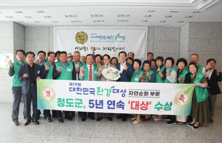 [뉴스서울] 청도군은 지난 5일 서울시 마포구 중소기업 DMC 타워에서 개최된‘제19회 2024 대한민국환경대상’에서 자원순환 부문 5년 연속 대상을 수상하였다.