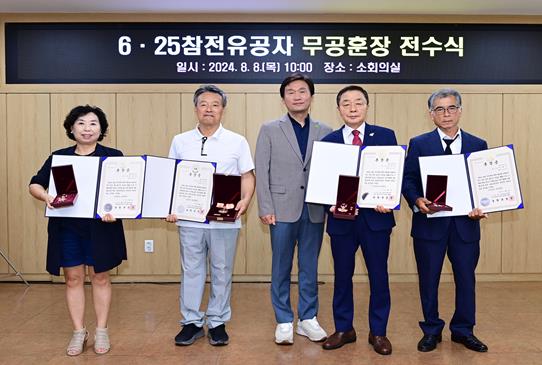 [뉴스서울] 경산시는 8일 소회의실에서 6·25한국전쟁에 참전해 공을 세운 故주후경 대위, 故박종길 소령, 故박태수 상병, 故정삼암 상병의 유가족에게 국방부장관을 대신하여 충무무공훈장과 화랑무공훈장을 전수했다.