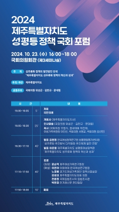 [뉴스서울] 제주특별자치도가 오는 23일 국회의원회관 제3세미나실에서‘제주특별자치도 성평등 정책 국회 포럼’을 개최한다.