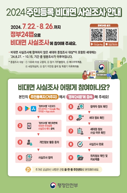 사실조사는 모든 세대를 대상으로 하며, ‘정부24앱’을 통한 비대면(디지털) 조사와 방문조사 방식으로 진행된다.