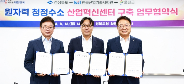 [뉴스서울] 울진군은 8월 12일 오후 2시, 경상북도청 화랑실에서 경상북도 및 한국산업기술시험원과 '원자력 청정수소 산업혁신센터 구축'을 위한 상호협력 업무협약(MOU)을 체결했다. 협약식에는 이철우 경북도지사, 손병복 울진군수, 김세종 한국산업기술시험원장이 참석했다.
