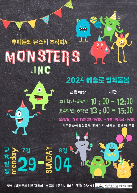[뉴스서울] 제주특별자치도 문화예술진흥원이 학령기 아동을 위한 교육프로그램 ‘예술로 방학돌봄 '우리들의 몬스터 주식회사'’를 선보인다.