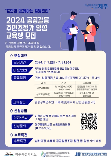 교육 참여는 지역 현안 및 갈등 해결에 관심있는 제주도민 누구나 가능하며, 7월 31일까지 선착순으로 20명 내외를 모집한다.