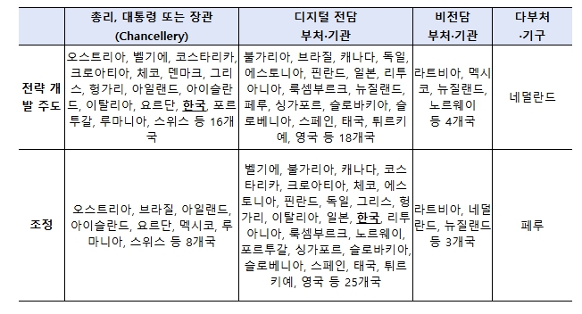 ▲ (거버넌스) 정부 고위급 또는 디지털 전담 부처에서 디지털 국가전략을 개발·조정하는 추세 |
