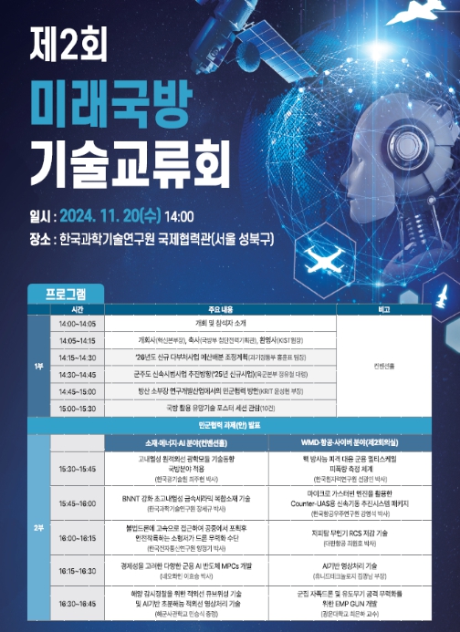 [뉴스서울] 과학기술정보통신부는 한국과학기술연구원(원장 오상록)과 함께 11월 20일 한국과학기술연구원(KIST) 본원에서 「제2회 미래국방 기술교류회」를 개최하였다고 밝혔다.