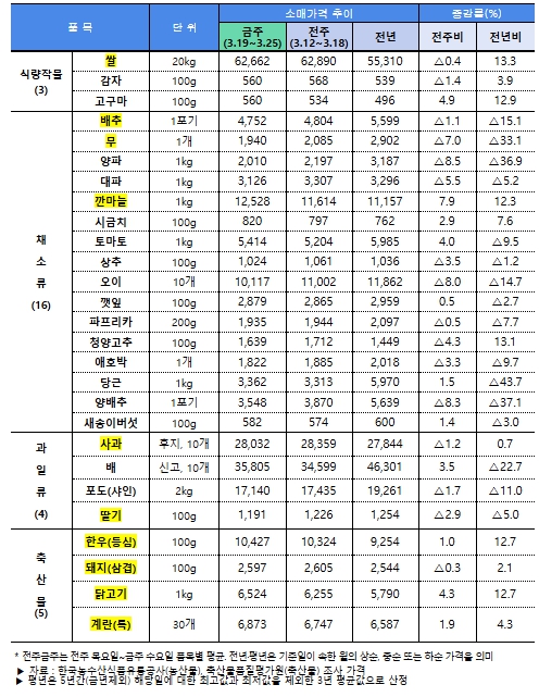 | ▲ 주요 농축산물(28개 품목) 소비자가격 동향(3.26일 기준) |