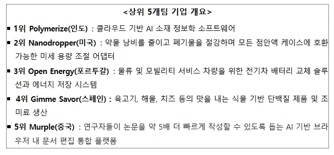 상금 15만달러를 받을 올해 최고의 외국인 창업팀으로는 ‘Polymerize’가 선정됐다. 2위는 ‘Nanodropper’, 3위는 ‘Open Energy’가 차지했다.