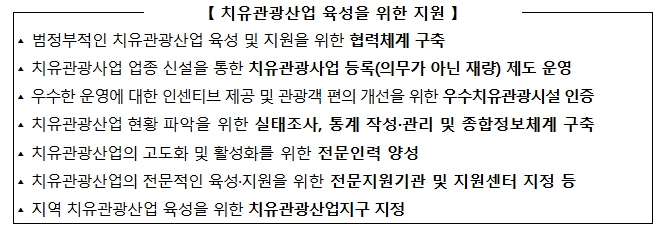 이번 「치유관광산업법」에서는 세계적으로는 ‘웰니스관광’으로 통용되는 ‘치유관광’을 “경관, 온천, 음식, 맨발걷기길 등 치유관광자원을 활용해 건강의 회복과 증진을 도모하고, 삶의 질 향상을 추구하는 관광활동”으로 정의하고, 치유관광자원, 치유관광시설 등의 정의도 명시해 정책 대상과 그 목표를 나타내고 있다. 또한 치유관광산업의 육성을 위한 기본계획 수립과 다양한 국가적 지원시책(아래 표 참고)을 규정하고 있다.