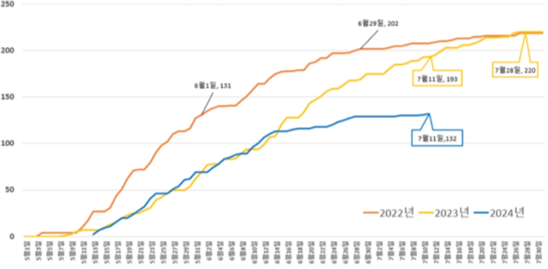▲ 2022년~2024년 5~7월 과수화상병 발생(건, 누계) |