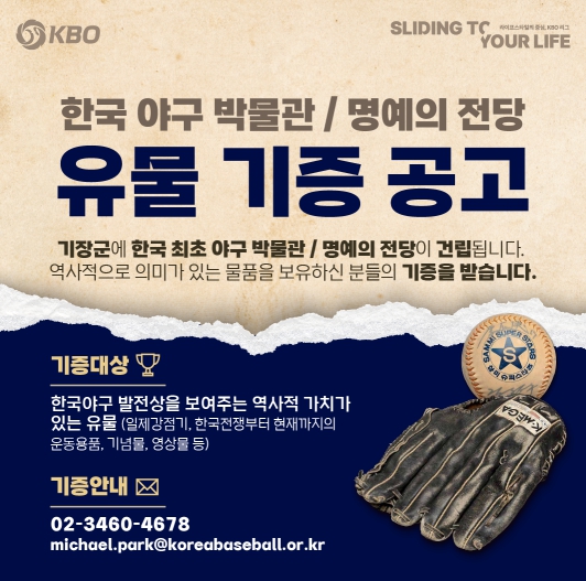 KBO는 2026년 완공 예정인 기장 야구박물관, 명예의 전당을 야구인, 팬들과 함께 만들어가기 위해 야구 유물을 기증받는다.