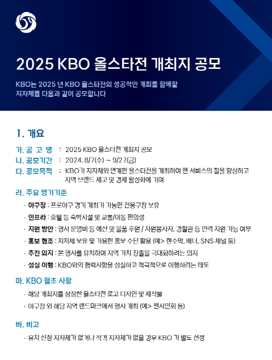 ▲ 2025 KBO 올스타전 개최지 공개모집 안내 |
