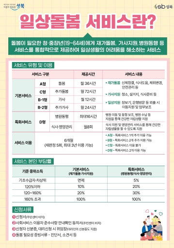 일상돌봄 서비스는 사회서비스 이용권(바우처) 발급을 통한 방식으로 제공되며 최초 6개월, 최대 3년(재판정 5회)까지 이용 가능하다. 또한, 성북구민이라면 누구나 신청이 가능하며 소득수준에 따라 차등 본인부담금이 발생할 수 있다.(건강보험료 기준, 기초수급자·차상위 기본서비스 무료)