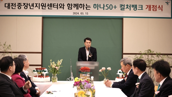 [뉴스서울] 대전시의회 이상래 의장은 15일 대흥동 소재 하나은행 대전지점에서 개최된 ‘대전 중장년 컬처뱅크 개점식’에 참석해 관계자들과 인사를 나누고 중장년을 위한 새로운 공간 마련에 감사의 마음을 전했다.