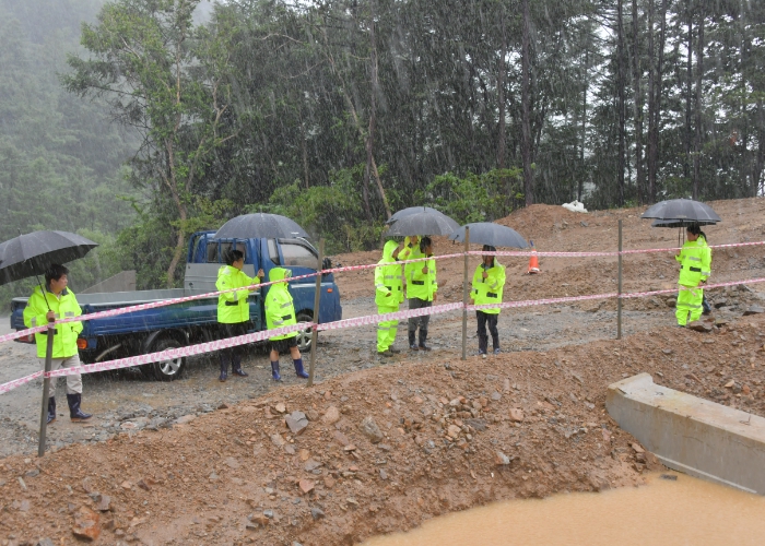 이번 점검은 대형 공사장, 산사태 위험 급경사지 등 총 중점 취약시설 3개소와 주택가 등 재해취약지를 대상으로 진행됐다. 점검내용은 대형 공사장의 토사유출 예방시설 설치 상태, 주택가 사면 임시조치 및 붕괴위험 여부, 교량 및 도로개설 구간의 사면 유실 여부, 배수로 퇴적물 관리 상태 등을 꼼꼼하게 점검했다.