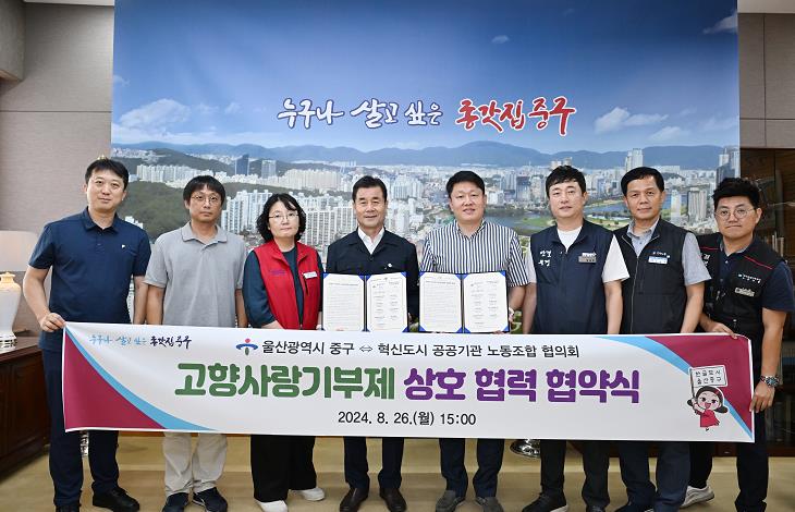[뉴스서울] 울산 중구와 혁신도시 공공기관 노동조합 협의회가 8월 26일 오후 3시 중구청 구청장실에서 고향사랑기부제 활성화를 위한 ‘고향사랑기부제 상호 협력 협약’을 체결했다.