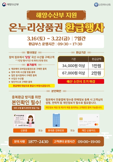 이번 행사는 경상북도 내 162개 인정(등록)시장 중 6개 시장(경산공설시장 포함)이 선정된 결과로 경산공설시장 및 중앙상점가 내 19개 대상 점포에서 국내산 수산물을 구매하면 구매자에게 최대 2만원의 온누리상품권을 지급하는 것이다. 34,000원 이상 67,000원 미만 구매 시 1만원, 67,000원 이상 구매 시 2만원을 온누리상품권(지류형)으로 환급받는 행사로 당일 구매 영수증을 경산공설시장 어물지구 1층(상인회사무실 옆) 환급처에 제시하면 된다. 또한 4월(4.13.~4.19.)은 하양꿈바우시장, 5월(5.4.~5.8.)은 경산공설시장에서 온누리상품권 환급행사가 예정돼 있다.