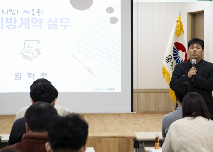 이번 교육은 한국지방공제회의 권혁훈 전문강사가 진행했으며 지방계약의 예규 소개, 계약방법의 종류 및 결정, 수의계약, 하도급, 지