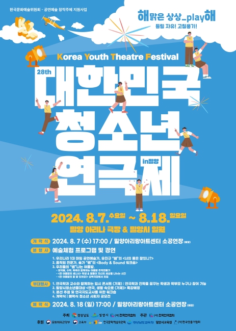 올해 청소년연극제는‘해맑은 상상 Play 해-틀릴 자유! 고칠 용기!’라는 주제로 오는 18일까지 12일간의 여정으로 밀양아리나와 밀양시 일원에서 펼쳐진다.