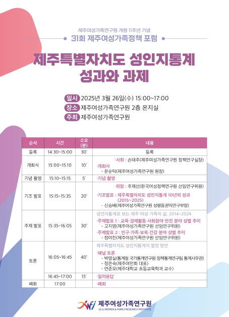 [뉴스서울] 제주여성가족연구원은 3월 26일 오후 3시 제주여성가족연구원 2층 온지실에서 “제주특별자치도 성인지통계 성과와 과제”란 주제로 제31회 제주여성가족정책포럼을 개최한다.