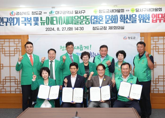[뉴스서울] 청도군은 27일 대구광역시 달서구와 군청 제1회의실에서 인구 위기 극복 및 뉴(NEW)새마을운동의 일환인 결혼 문화 확산을 위한 업무협약을 체결했다.