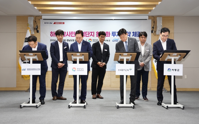 이날 협약식에는 박완수 도지사를 비롯해 최윤성 ㈜한국토지신탁 부회장, 하승철 하동군수, 선양규 광양만권경제자유구역청장 직무대리가 참석한 가운데 진행됐으며, 도는 이번 투자협약을 통해 장기간 표류하던 하동 갈사만 산업단지를 정상궤도에 올릴 수 있을 것으로 기대한다.
