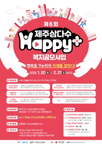 제주특별자치도개발공사(사장 백경훈)는 도민이 체감할 수 있는 지역 밀착형 복지사업 발굴을 위해 ‘제6회 제주삼다수 Happy+ 복지 공모사업’을 추진한다고 20일 밝혔다.