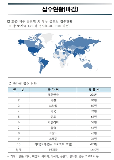 지난 3월 31일 18시 한국 시간을 기준으로 마감된 공모전은, 총 95개국에서 1,210편의 AI 영상 작품이 접수되어 제주가 글로벌 AI 콘텐츠 허브로 도약할 가능성을 입증했다.