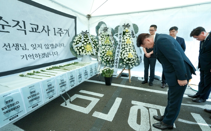 [뉴스서울] 오영훈 제주특별자치도지사는 17일 오후 제주도교육청 주차장에 마련된 서울 서초구 서이초등학교 교사 분향소를 찾아 순직 1주년을 추모했다.