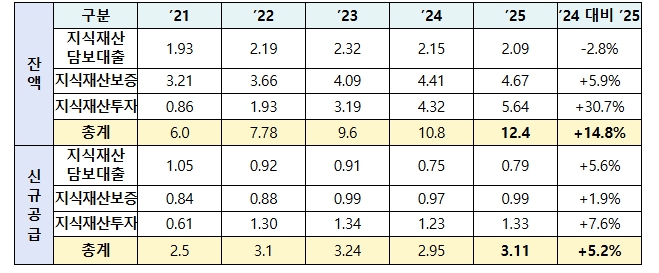 지식재산 금융 잔액은 ’24년 말 10.8조원에서 ’25년 말 12.4조원으로 증가하여 전년대비 14.8% 성장했다. 2025년 지식재산 금융 신규공급은 총 3.1조원으로, 2024년 2.95조원 대비 5.2% 증가했다.