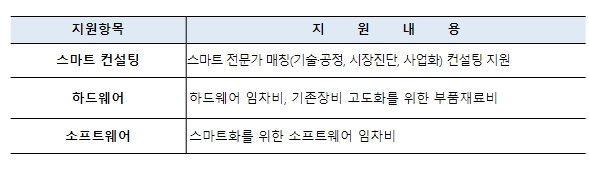 선정기업에 대해서는 전담 상담사(컨설턴트)가 소공인 업종특성, 상황, 수준, 역량 등을 분석 후, 맞춤형 해결방안(솔루션 및 개선방안) 등에 대한 상담(컨설팅)을 제공하고,기계장비 및 부품 등 장비·재료비와 공정개선, 생산관리 및 제품개발 등 지능형(스마트)기술 도입에 소요되는 비용을 업체당 최대 42백만원까지 지원한다.