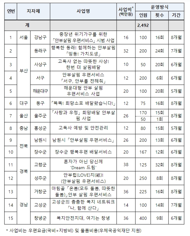이번 안부 살핌 우편서비스 시범 사업은 올해 연말까지 진행되며, 사업의 원활한 추진을 위해 선정된 지자체에 국비를 지원하고, 우정사업본부는 물품구입에 소요되는 비용을 지원한다.