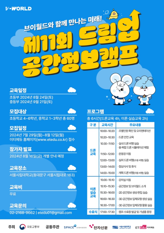 이번 '제11회 드림업 공간정보 캠프' 참가 신청은 이티에듀(주) 누리집을 통해 할 수 있으며, 캠프 지원동기, 공간정보에 대한 관심도 등을 심사하여 초·중학생 각 30명씩 총 60명을 선발할 계획이다.