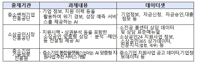 이번 공모전에 과제를 출제하는 기관은 총 3곳*으로 ▲중소기업 성장·위험 예측, ▲소상공인 맞춤형 전문상담(컨설팅), ▲중소기업 통합플랫폼 기반 지원사업 추천 3개 분야 과제를 제출하고 기관들이 보유한 양질의 데이터를 제공한다. 각 기관에서 제공하는 데이터는 가공 및 비식별화해 제공될 예정이다.