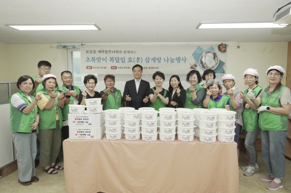 보문동 새마을부녀회 한경숙 회장은 “정성껏 준비한 삼계탕으로 어르신들이 더위를 이겨내고 활력 넘치는 여름을 보냈으면 좋겠다”라며 “앞으로도 함께 돕고 나누는 온정이 넘치는 지역공동체를 만들기 위해 노력하겠다”라고 말했다.