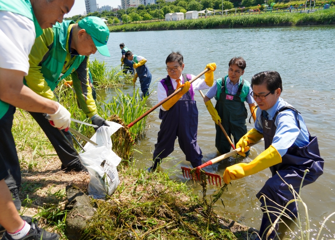 ▲ 4일 새마을방역봉사대 발대식 후 이어진 중랑천 정화 활동 |