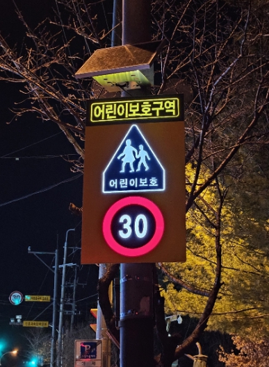 ‘발광형 표지판’은 기존 일반 표지판보다 야간·악천후 상황에서도 시인성이 탁월하고 운전자들이 어린이보호구역임을 쉽게 인식하고 일시 정지할 수 있도록 유도하는 것이 특징이다.