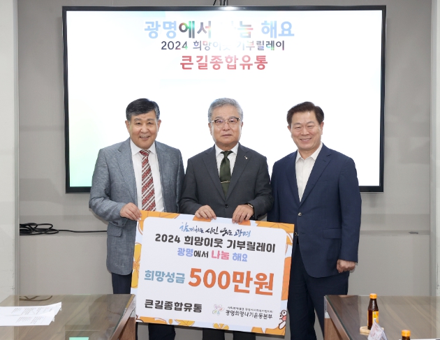 ▲ 큰길종합유통은 저소득 가정을 위해 희망성금 500만 원을 전달했다. 사진 왼쪽부터 이상재 광명시사회복지협의회장, 김재일 큰길종합유통 대표, 박승원 광명시장. |