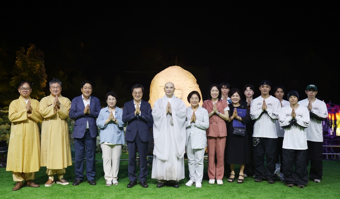 | ▲ 27일 저녁 제22회 봉선사 연꽃축제에서 김동연 경기도지사가 호산 스님 및 참석자들과 기념촬영을 하고 있다 |