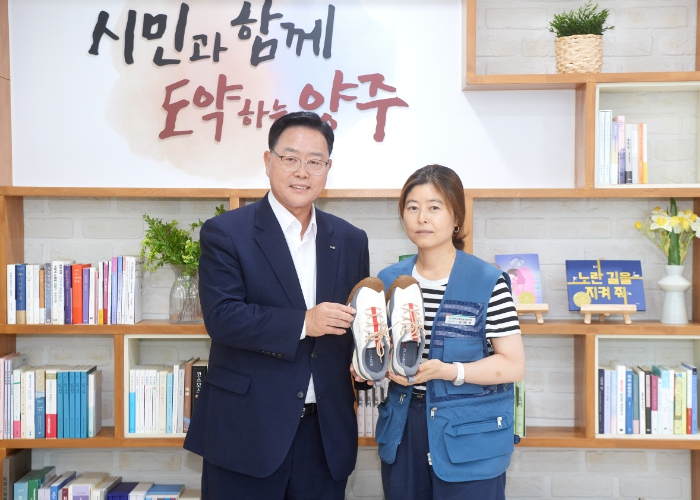 [뉴스서울] 양주시공무원노동조합이 10일 오전 양주시청 2층 시장실에서 열린 강수현 양주시장과의 간담회 자리에서 운동화를 직접 전달했다.