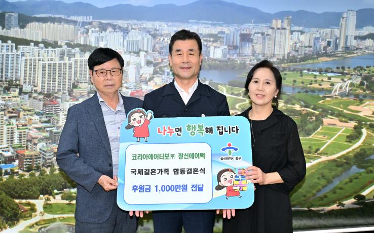[뉴스서울] 코리아에어터보㈜ 광신에어택이 5일 오후 3시 30분 중구청 구청장실을 방문해 울산중구가족센터를 수탁 운영 중인 희망나눔동행에 국제결혼가족 합동결혼식 후원금 1,000만 원을 전달했다.