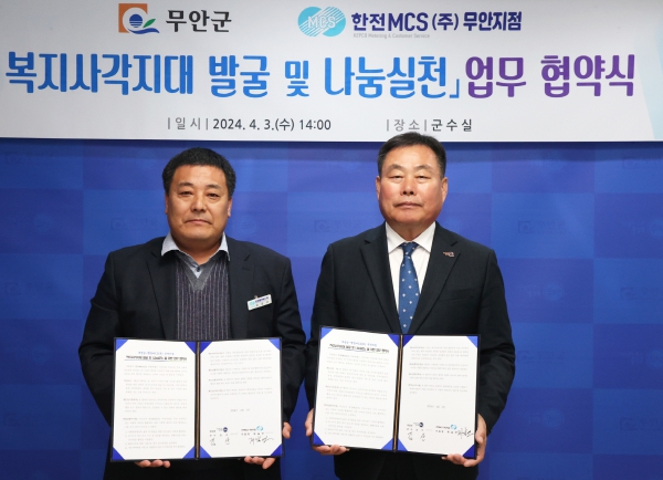 [뉴스서울] 전남 무안군은 3일 한전MCS(주) 무안지점과 복지사각지대 발굴 및 나눔 실천을 위한 업무협약을 체결했다.